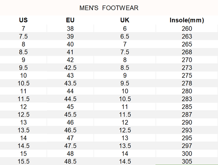 US 7.5/UK 6.5, US 8/UK 7, US 8.5/UK 7.5, US 9/UK 8, US 10/UK 9, US 11/UK 10, US 12/UK 11, US 13/UK 12 |